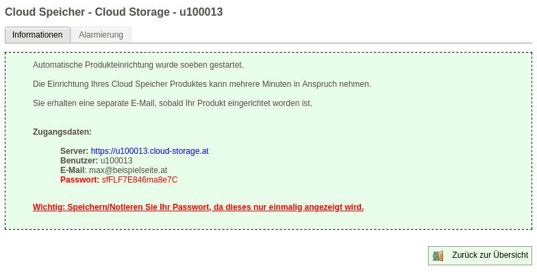 Als nächstes erhalten Sie eine Erfolgsmeldung, dass die automatische Produkteinrichtung gestartet wurde mitsamt eines generierten Passwortes: