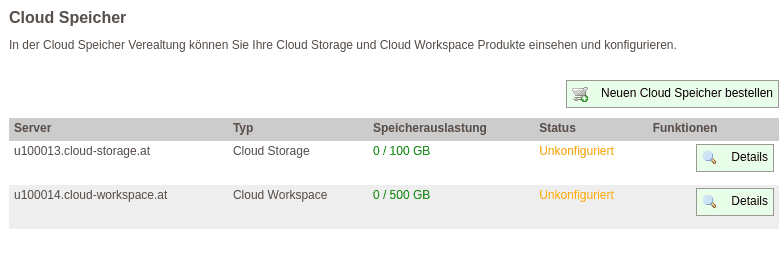 Ihr neu bestellter Cloud Speicher wird Ihnen in dem Status „Unkonfiguriert“ übergeben. Um die Konfiguration abzuschließen, melden Sie sich bitte im IPAX Control Panel unter https://cp.ipax.at an. Navigieren Sie anschließend zu dem Menüpunkt „Cloud Speicher“, hier finden Sie eine Übersicht über all Ihre Cloud Speicher Produkte: