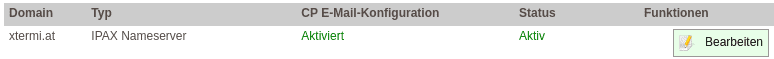 Gibt Auskunft, ob E-Mail Funktionen für die jeweilige Domain zur Verfügung stehen. Wenn der Status „aktiviert“ lautet, so stehen nachfolgende Verwaltungs-Funktionen im Control Panel zur Verfügung: