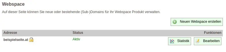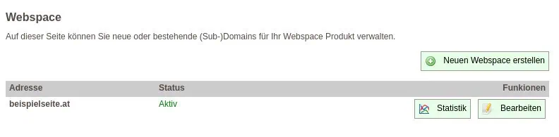 Navigieren Sie als nächstes auf den Menüpunkt Webspace und klicken bei dem gewünschten Webspace auf die Funktion „Bearbeiten“.