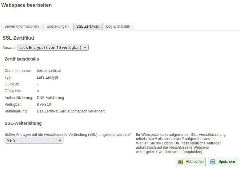 Optional kann auch noch eine automatische SSL-Weiterleitung auf die gewünschte Domain konfiguriert werden.