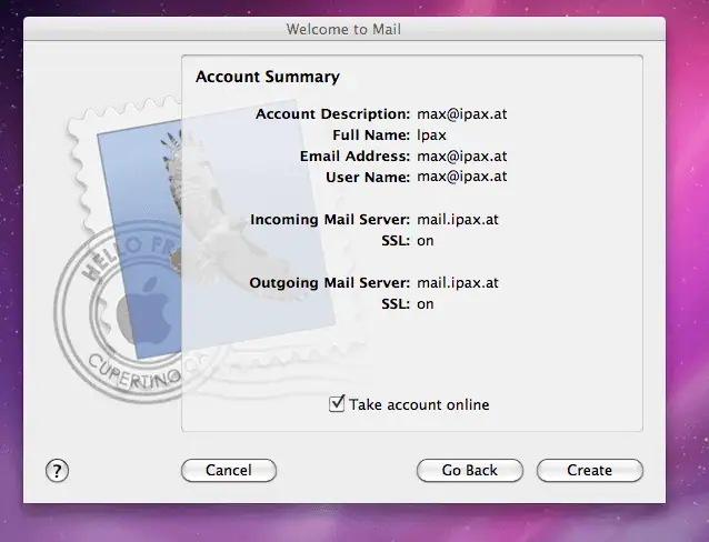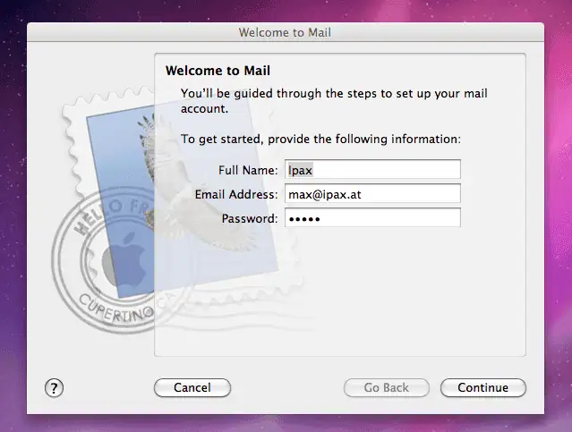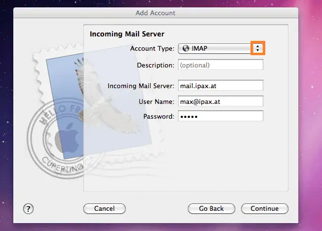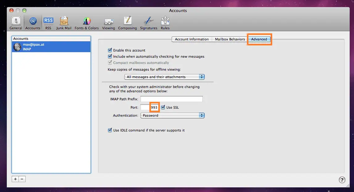 Account Type: IMAP Incoming Mail Server: mail.ipax.at User Name: max@ipax.at Password: beispielpasswort