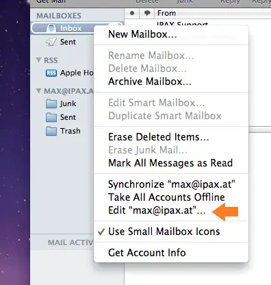 Klicken Sie bitte mit einem rechts Klick auf Ihre neu erstellte „Inbox“. Somit öffnet sich ein Feld in dem Sie „Edit „max@ipax.at“ wählen.
