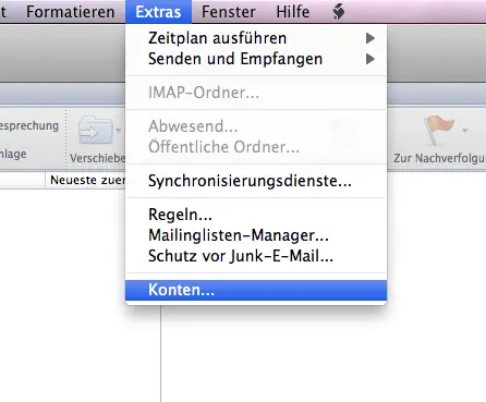 Öffnen Sie das Programm Outlook 2008 und wählen Sie bitte den Menüpunkt „Extras“. Klicken Sie anschließend auf den Unterpunkt „Konten…“.