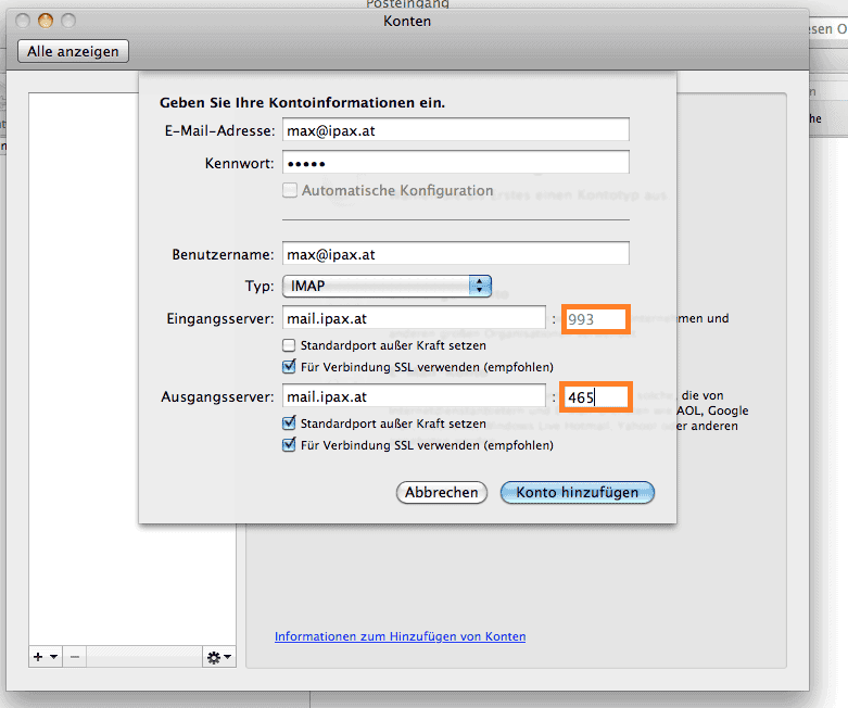 E-Mail Adresse: max@ipax.at Kennwort: beispielpasswort Benutzername: max@ipax.at Typ: IMAP Eingangsserver: mail.ipax.at : 993
