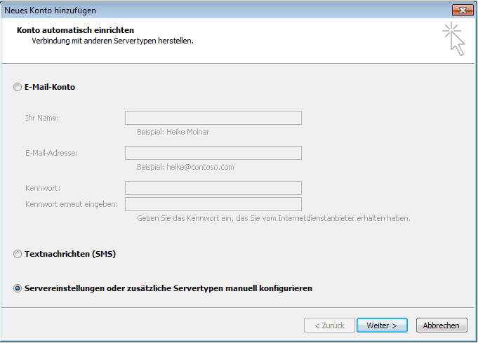 In den Kontoeinstellungen sehen Sie drei Überschriften. Wählen Sie „Servereinstellungen oder zusätzliche Servertypen manuell konfigurieren“ und klicken auf den Button „Weiter“.