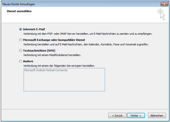 In diesem Menüpunkt wählen sie bitte „Internet-E-Mail“ (Verbindungen mit dem POP- oder IMAP-Server herstellen, um Nachrichten zu senden und empfangen).