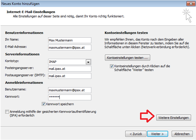 Kontotyp: IMAP Posteingangsserver: mail.ipax.at Postausgangsserver: mail.ipax.at
