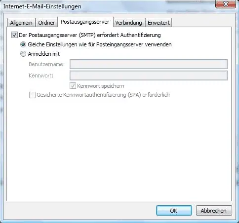 Wählen Sie die Registerkarte „Postausgangsserver“ und setzen das Häckchen bei „Der Postausgangsserver (SMTP) erfordert Authentifizierung“.