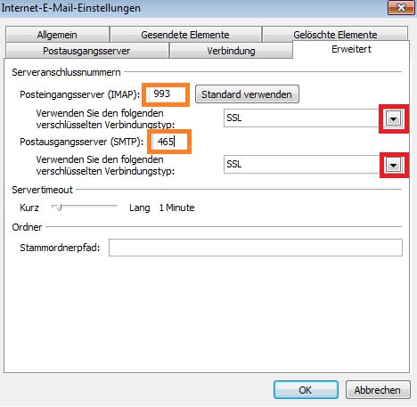 Wählen Sie die Registerkarte „Erweitert“ und geben für den Posteingangsserver (IMAP) den Verbindungstyp „SSL“ und den Port 993 und für den Postausgangsserver (SMTP) den Verbindungstyp „SSL“ den Port 465 an. Im Anschluss bestätigen Sie alle Eingaben mit einem Klick auf „OK“ und Sie gelangen zu den Internet E-Mail Einstellungen zurück.