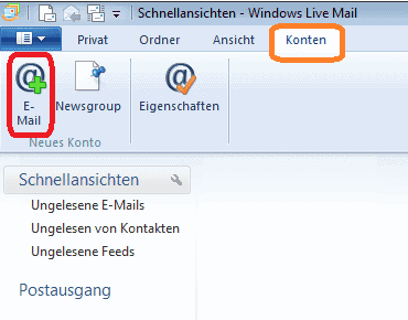 Starten Sie Windows Live Mail und wählen Sie den Menüpunkt „Konten“ und klicken anschließend auf den Button „E-Mail“.