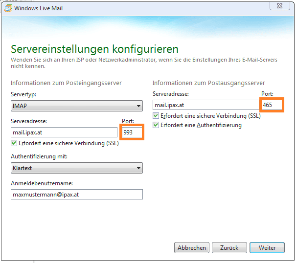 Servertyp: IMAP Serveradresse: mail.ipax.at Port: 993