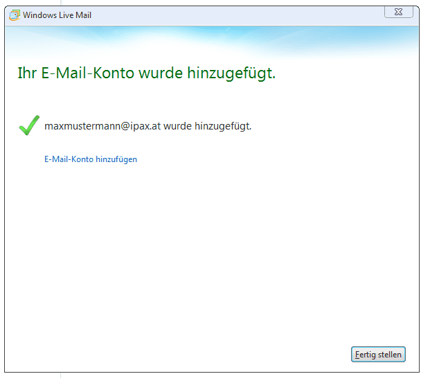 Klicken Sie anschließend auf „Fertig stellen“. Gratulation, Sie haben die Konfiguration Ihres IPAX E-Mail Kontos erfolgreich abgeschlossen!