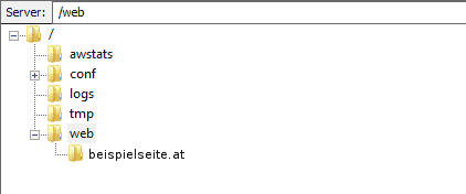 Im Ordner web finden Sie für jede Webseite einen weiteren Ordner. Wenn Sie nun Ihre Webseite ins Internet stellen möchten, müssen Sie die nötigen Dateien in das Verzeichnis für die Zieladresse (z.B: /web/beispielseite.at) hochladen.