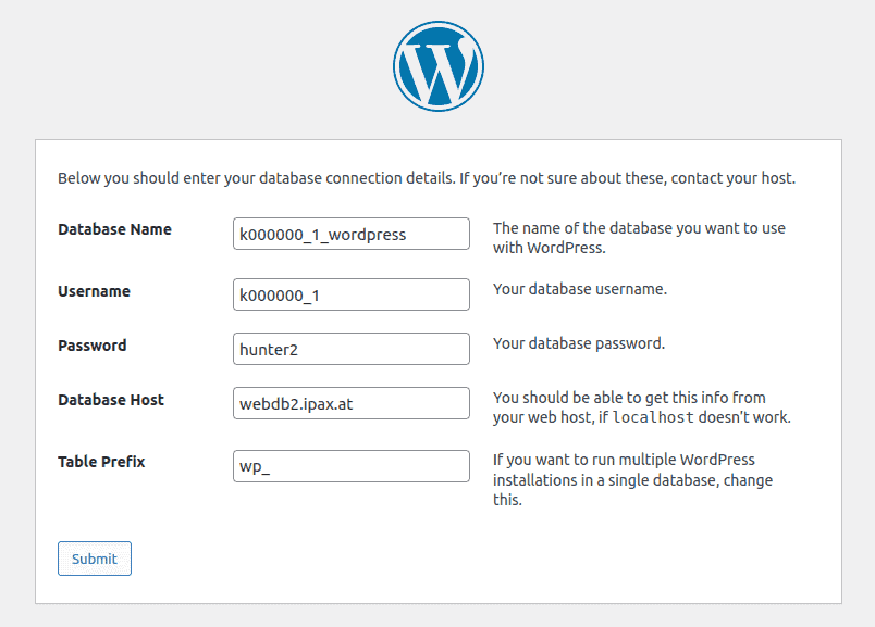 - Geben Sie nun unter Database Name den Namen Ihrer Datenbank, unter Username den Benutzer der Datenbank, unter Password sein Passwort und als Database Host den Server Ihrer Datenbank ein. Diese Informationen finden Sie für die erste Datenbank im IPAX Zugangsdaten Dokument. Für weitere selbstständig angelegte Datenbanken werden diese Informationen unmittelbar nach dem Anlegen im IPAX Control Panel einmalig angezeigt.